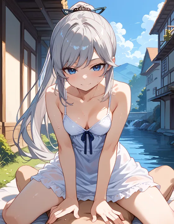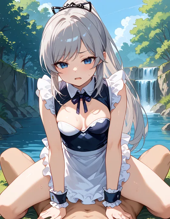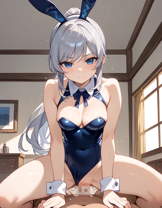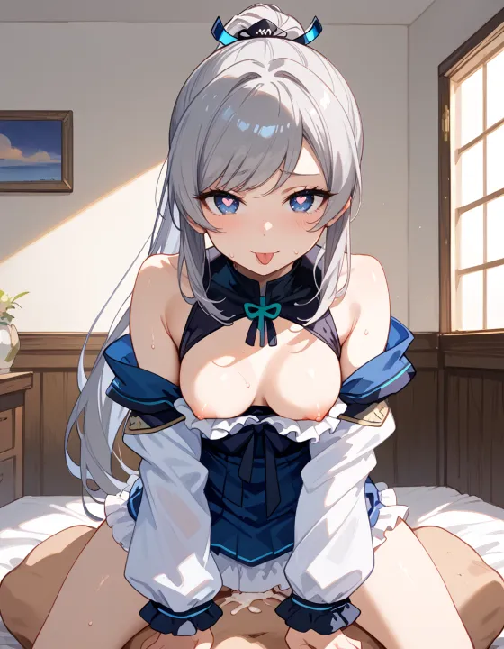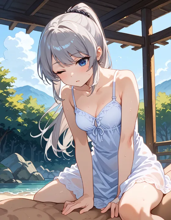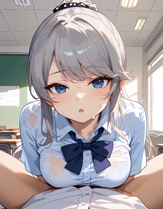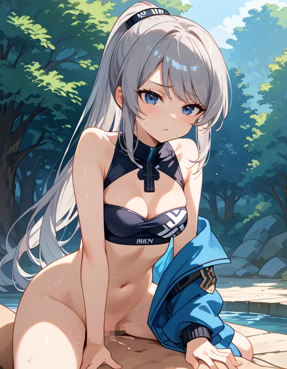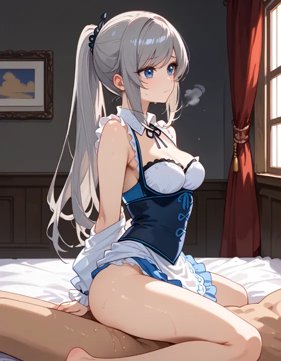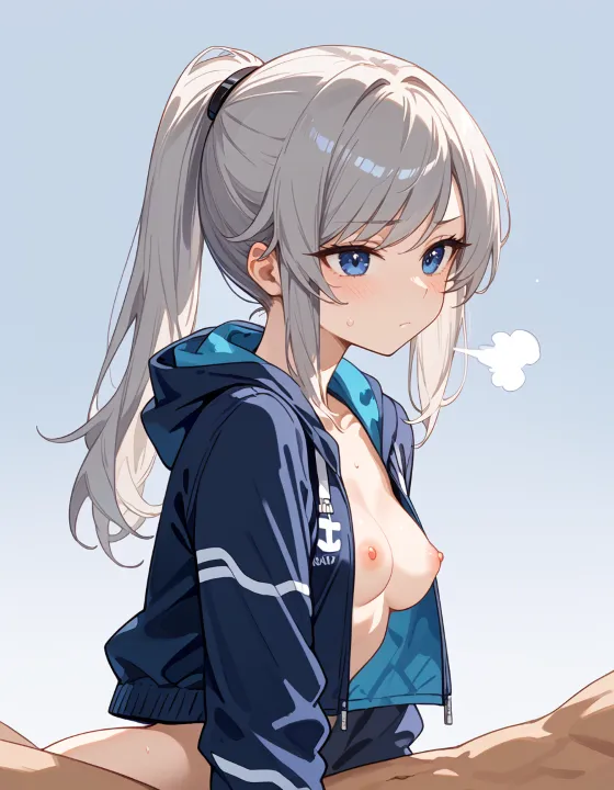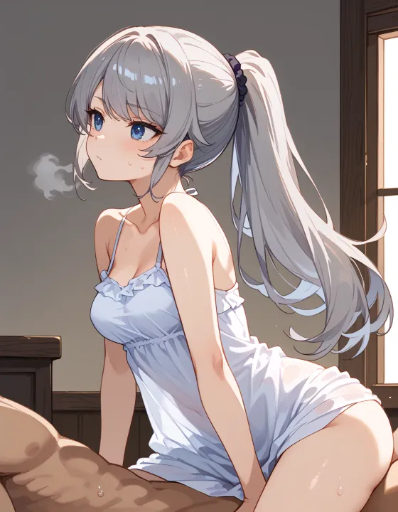 nsfw, 1girl, (ash gray hair:1.2), (long hair, swept bangs, thin bangs, framing the face sidelocks:1.1), simple hair elastic, (straight hair, high ponytail:1.3), natural breasts, (dark blue eyes, darkblue eyes:1.1), hazel tint, reflective eyes, BREAK