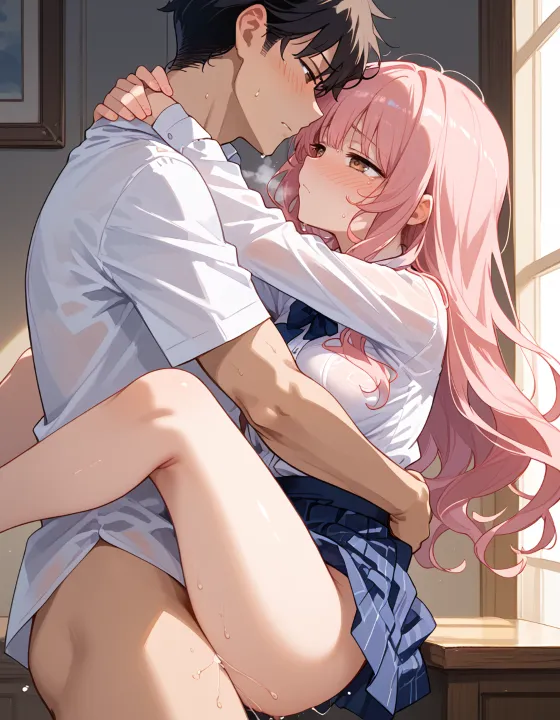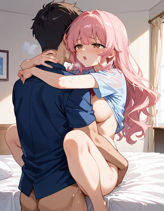 nsfw, 1girl, pastelpink hair, wavy hair, long hair, large breasts, brown eyes,