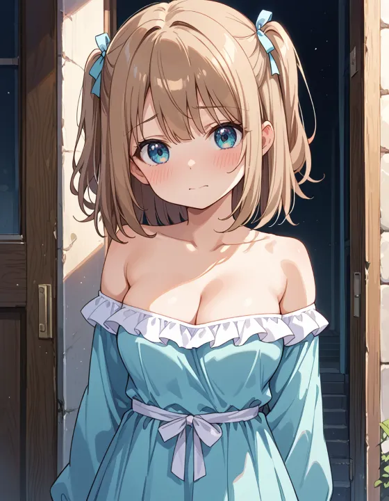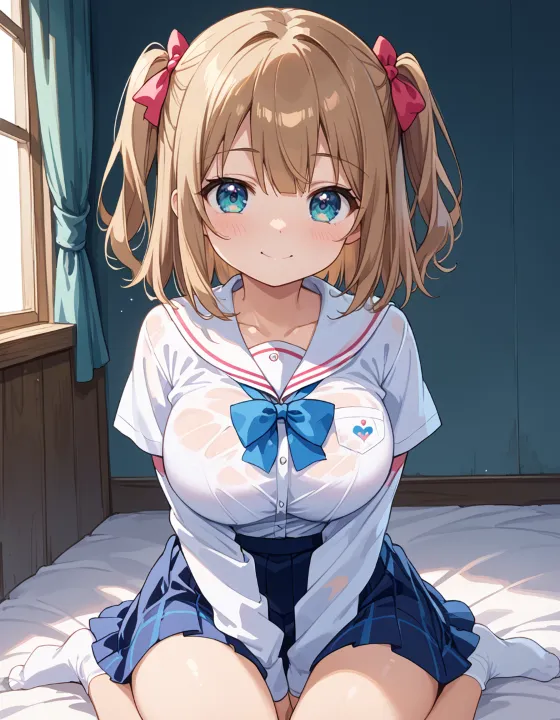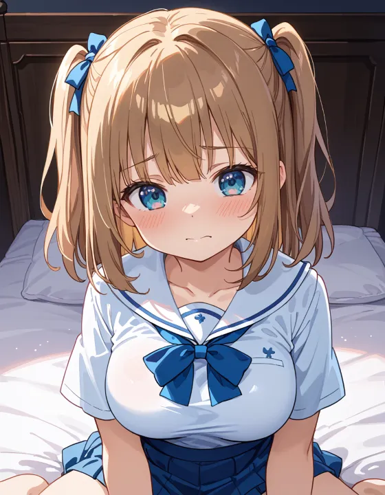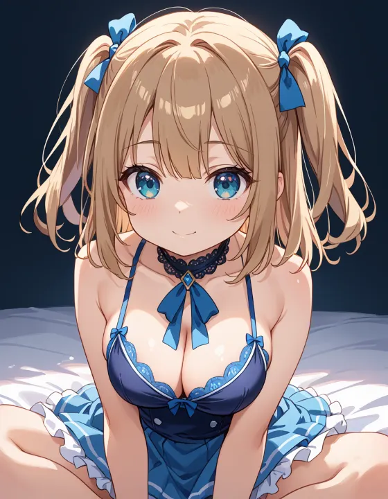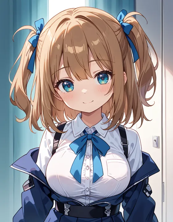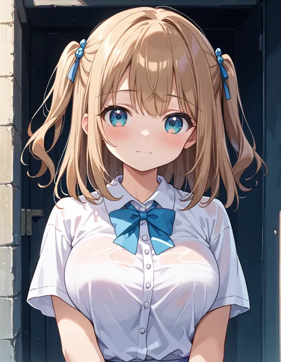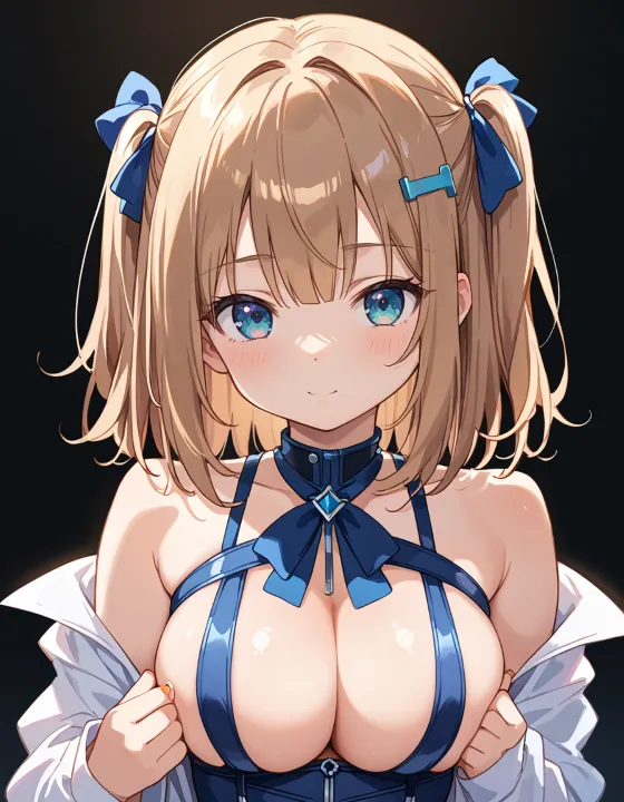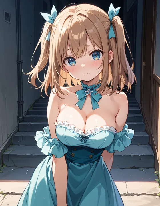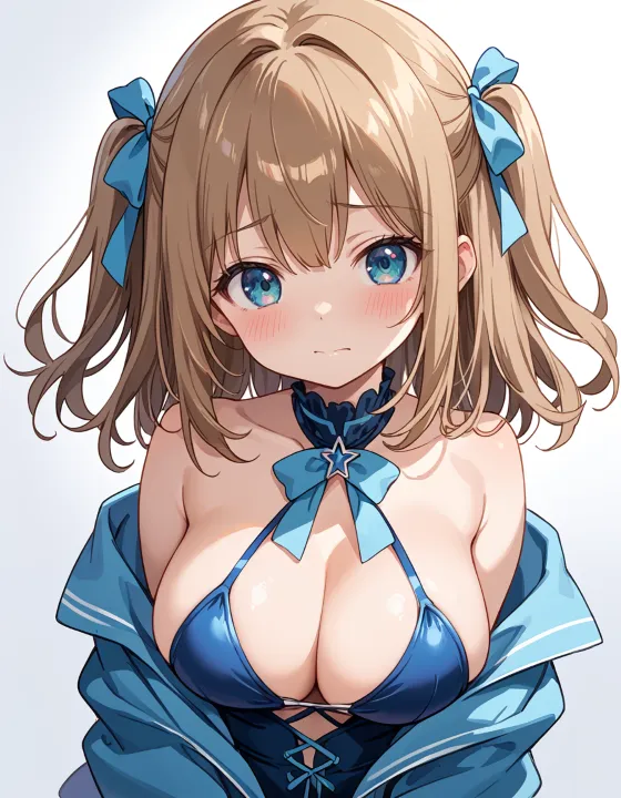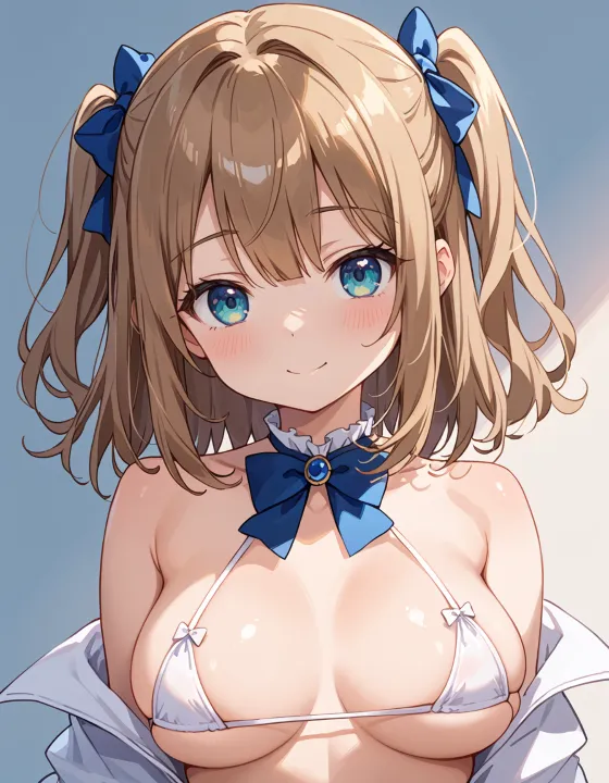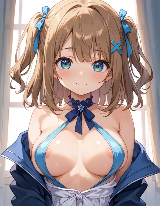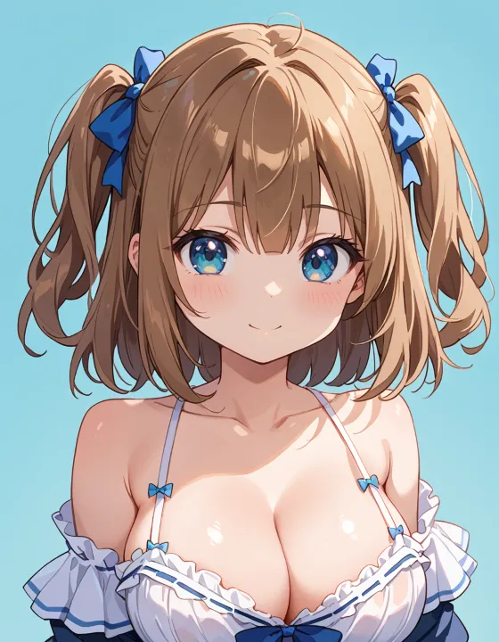 nsfw, 1girl, (llll, pppppp:1.1), gradient eyes, green-blue eyes, (large breasts, big breasts:1.1), perky breasts, two side up, long-medium hair, soft brown hair, BREAK
