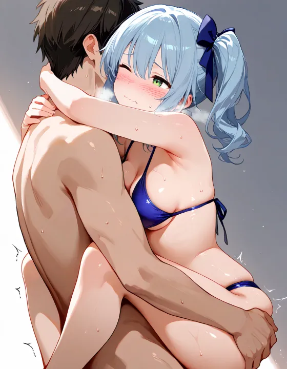 nsfw, 1girl, 15yo, (medium breasts:1.1), light-green eyes, (side ponytail:1.2), (medium hair:0.8), light-blue hair BREAK