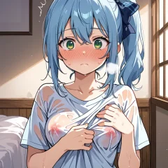 【二次元】巨乳が服の隙間からこぼれて胸チラしてる童顔黒髪美少女のエロ画像【AIエロ】